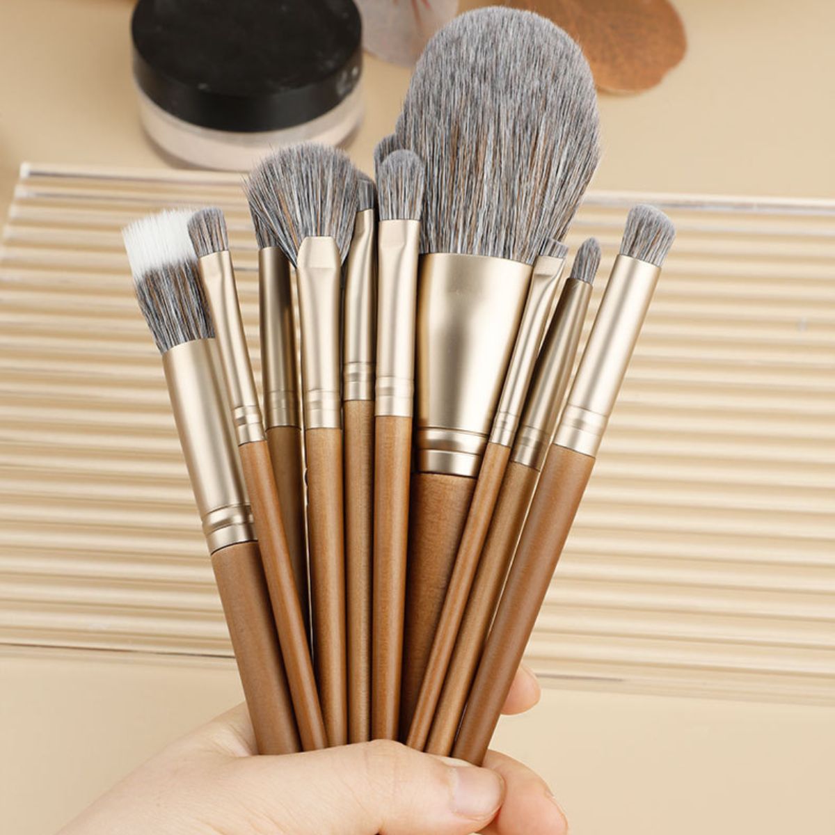 Die weichen, dichten Kunstfasern sind so konzipiert, dass sie Puder-, Creme- und Flüssigprodukte gleichmäßig und makellos verteilen, während die ergonomischen Griffe aus Walnussholz einen bequemen Halt und ein elegantes, natürliches Aussehen bieten. Die verstärkten Aluminiumzwingen sorgen für zusätzliche Haltbarkeit und Stabilität, sodass Ihre Pinsel dem täglichen Gebrauch standhalten.