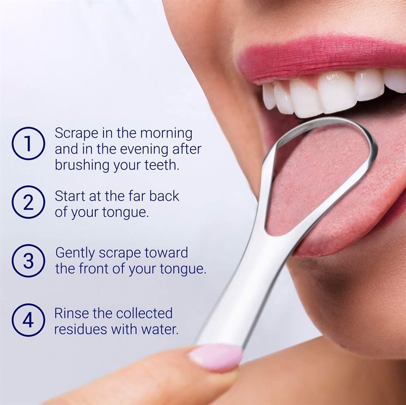 - Verwenden Sie den EB Tongue Scraper jeden Morgen vor dem Zähneputzen: